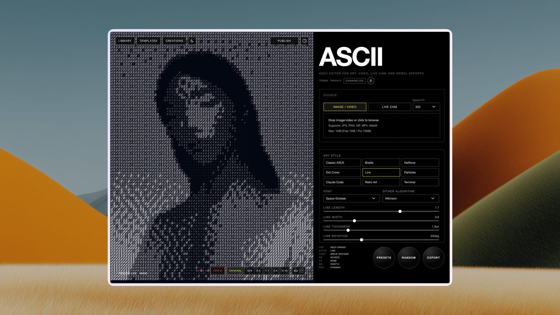 ASC11 is an ASCII art generator that converts images, videos, live camera feeds, and templates into ASCII art. Perfect for creating unique visual content for websites and marketing campaigns with a retro, text-based aesthetic.