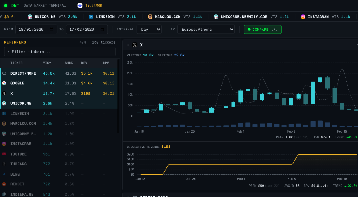 A Bloomberg terminal-style interface for web analytics that lets you track referrers, revenue, and conversions in real time. Provides a professional dashboard experience for monitoring website performance metrics.