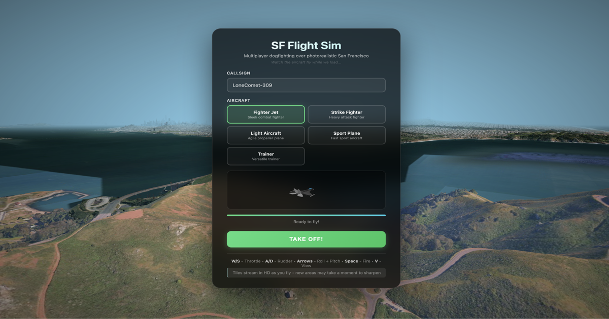 A free multiplayer browser-based flight simulator that lets you pilot fighter jets over photorealistic cities around the world. Experience realistic aerial combat and exploration directly in your web browser without any downloads.