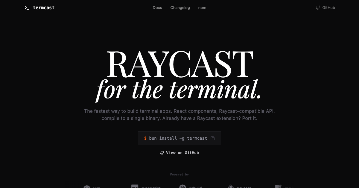 A React-based framework for building terminal user interfaces that's compatible with Raycast APIs. Enables developers to create powerful CLI applications with components like lists, forms, and charts that compile to single binaries.